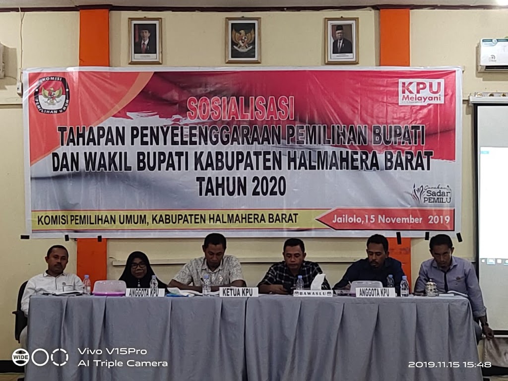 JAILOLO,Legalpost.id- Komisi Pemilihan Umum (KPU), menggelar Sosialisasi tahapan Penyelenggara pemilihan bupati dan wakil bupati kabupaten Halmahera Barat (Halbar), Jumat, 15 November 2019. Kegiatan dihelat di Aula KPU Halbar.