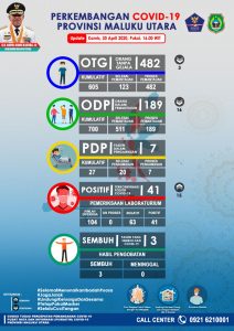 Ternate,LegalPost.id-Grafik positif covid-19 diprovinsi Maluku Utara(Malut) melonjak Drastis jadi 41 orang,dengan sebaran tertinggi dikota Ternate sebanyak 20 kasus.