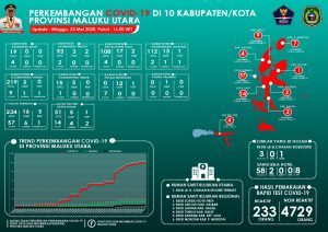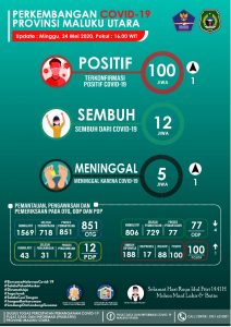 Hingga saat ini, total kasus positif COVID-19 di Malut mencapai 100 orang. sementara Orang Tanpa Gejala 851 orang, Orang Dalam Pemantauan (ODP) 77 orang, PDP 12 orang, sembuh 12 orang dan meninggal 5 orang.