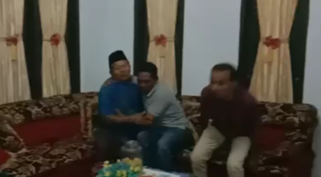 Keduanya yang berselisi saat penyemprotan disinfektan yang dilakukan Satuan Gugus (Satgus) Covid-19 kabupaten Halmahera Barat (Halbar) di desa Pateng kecamatan Jailolo, Kamis, 30 April 2020 lalu, kini nampak terlihat baikan, di rumah Bib Mahdi Albar desa Bobo kecamatan Jailolo.