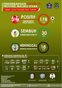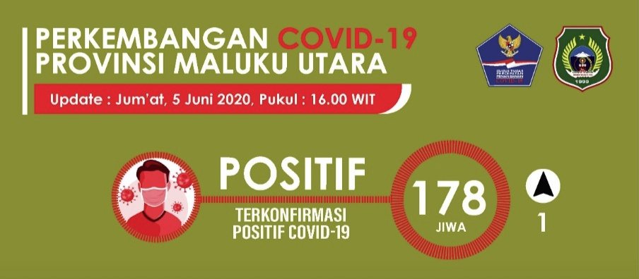 Ternate,LegalPost.id- Jumlah kasus Terkonfirmasi positif covid-19 diprovinsi Maluku Utara  bertambah 1 orang per 5 Juni 2020 sehingga meningkat jadi 178 orang.