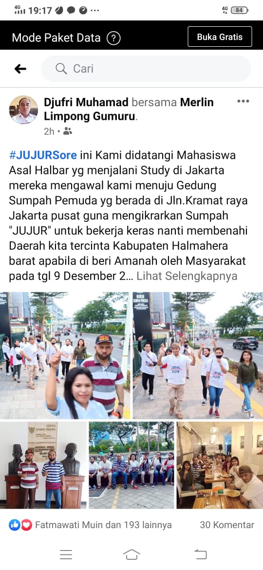Ririn mengatakan, sejumlah mahasiswa asal Halbar di Jakarta yang menuju gedung Sumpah Pemuda di Jakarta Pusat disesali jika diposting oleh salah satu kandidat melalui akun facebooknya dengan caption foto ".......mereka mengawal kami menuju gedung sumpah pemuda yang berada di Jalan Kramat Raya Jakarta Pusat guna mengikrarkan sumpah. Karena postingan itu merupakan tindakan merusak nama mahasiswa karena menggiring mahasiswa turut serta dalam agenda politik untuk menarik simpati.