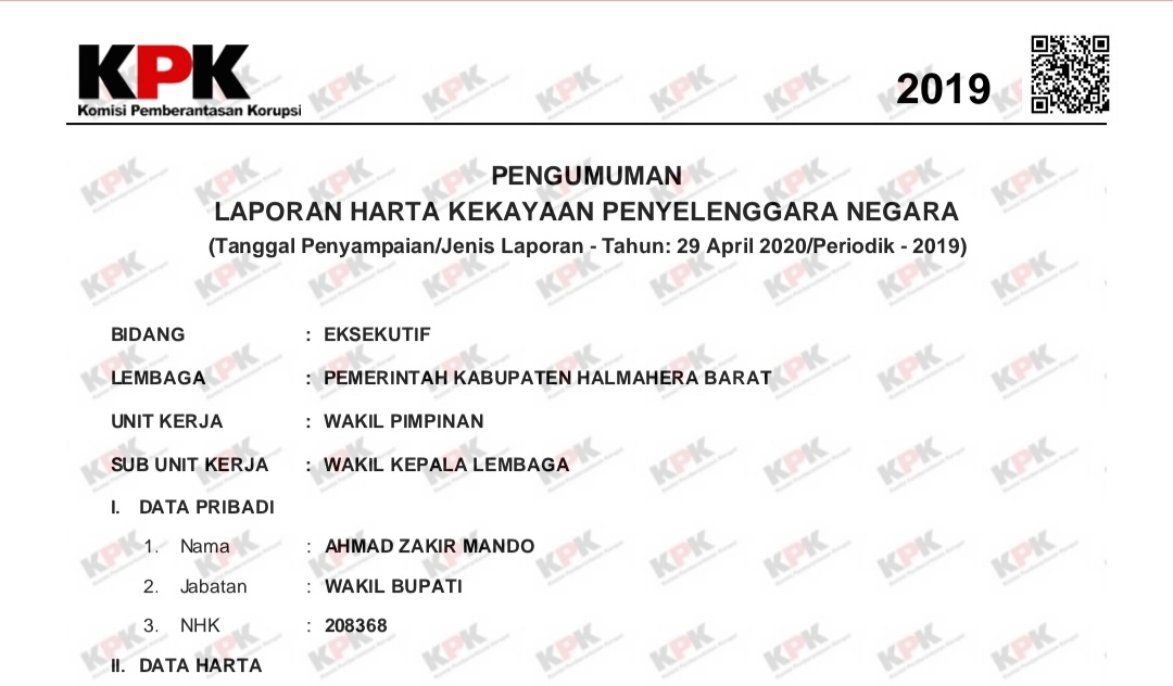NamunDenny Palar sendiri dalam LHKPN juga memiliki beban hutang sebesar Rp 414.126.726.Sehingga total harta kekayaan hanya terisa Rp. 1.960.286.669.Diperingkat ketiga bakal calon Bupati Zakir Mando yang juga wakil Bupati Aktif,yang berdasarkan LHKPN tertanggal 29 April 2020/periodik 2019.Total harta kekayaan Zakir Mando sebesar Rp. 1.355.115.300.Dimana,Zakir dalam LHKPN bahkan tercatat merupakan kandidat tanpa meninggalkan hutang,berbeda derngan Danny Missy,Denny Palar serta James Uang.Selain itu,dari total harta kekayaan itu terbesar berada di aitem tanah dan bangun seluas 100 m2/100 m2 di Halbar yang merupakan harta warisan senilai Rp.
