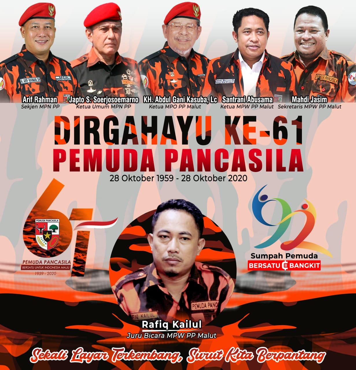 Juru bicara Pemuda Pancasila Provinsi Maluku Utara Rafik kailul kepada media ini mengatakan,MPW PP Malut bakal memperingati Hari Ulang Tahun Pemuda Pancasila sekaligus memperingati Sumpah Pemuda pada tanggal 28 Oktober mendatang.