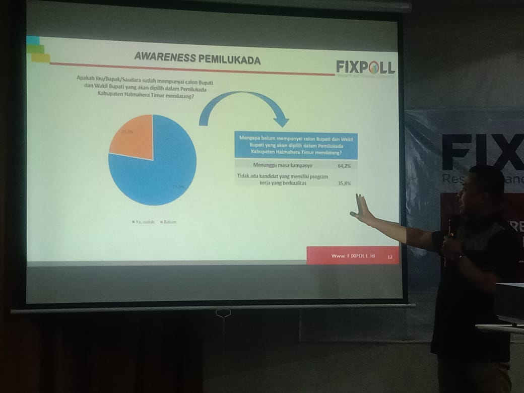 Ternate,Legalpost.id-Pilkada Haltim,ini Hasil Rilis Lembaga survei Fixpoll Indonesia terhadap Potret Prilaku Masyarakat Dan Menakar Peluang Calon Bupati/wakil Bupati Kabupaten Halmahera Timur terhadap 440 responden periode survei 2-6 November 2020 dalam Metedologi Survei,yang disampaikan diAula Hotel Muara Ruang Kieraha 6.