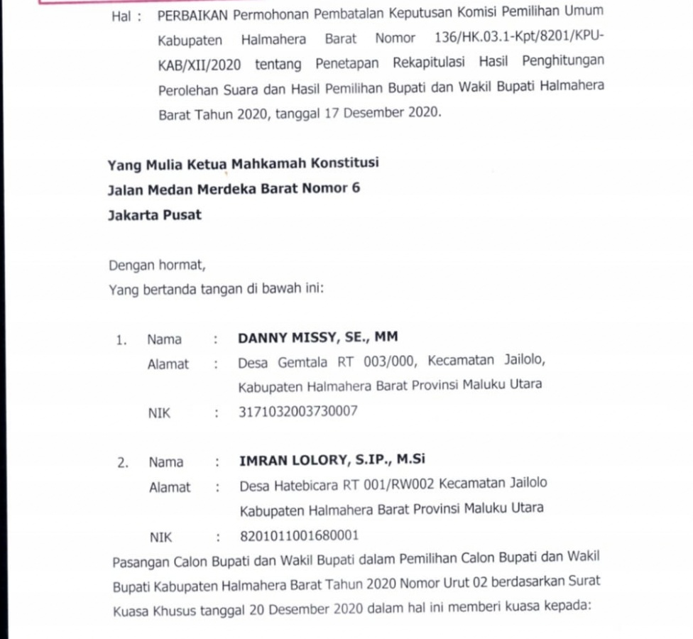 Alwi Ahmad ketua Bawaslu Halbar yang dikonfirmasi wartawan via WhatsApp, Sabtu, 23 Januari 2021 membenarkan bahwa saat ini Bawaslu lakukan fnishing keterangan di MK atas laporan Danny Missy ke MK terkait Permohonan ke MK untuk pembatalan Keputusan Komisi Pemilihan Umum Kabupaten Halmahera Barat Nomor 136/HK.03.1-Kpt8201/KPU-KABII/2020 tentang Penetapan Rekapitulasl Hasil Penghitungan Perolehan Suara dan Hasil Pemiihan Bupati dan Wakil Bupati Halmahnera Barat Tahun 2020, tanggal 17 Desember 2020.