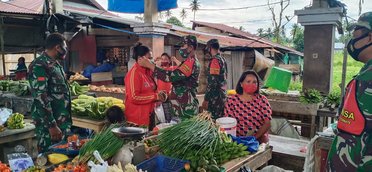 Danramil 1501-03/Jailolo Kapten Inf Suprapto memerintahkn kepada anggota Babinsanya, di lokasi kegiatan untuk selalu mengingatkan kepada warga masyarakat baik di pasar pelabuhan maupun di jalan agar mentaati Protokol kesehatan Covid-19 dengan melakukan 5M, Memakai masker, Mencuci tangan, Menjaga jarak, Menghindari kerumunan dan Membatasi mobilitas.