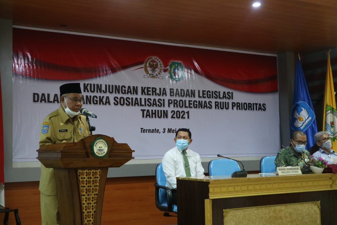 Ternate,legalpost.id-Wakil Gubernur Maluku Utara (Malut) Ir. Al Yasin Ali. ST, MMT menghadiri acara sosialisasi Program Legislasi Nasional (Prolegnas) Rancangan Undang-Undang RUU Prioritas Tahun 2021 diselenggarakan oleh DPR-RI di Provinsi Malut, bertempat di Gedung Aula Nuku Universitas khairun Ternate, Senin (3/5/2021).