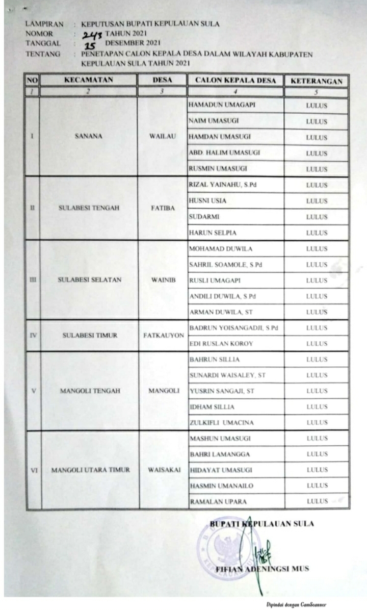 "Dari 39 orang Cakades yang ikut tes yang dilaksanakan oleh Panitia Pilkades Kabupaten, maka 26 Orang Cakades di nyatakan lolos Seleksi dan bisa melanjutkan ke tahapan selanjutnya dan berhak mengikuti Pencalonan Kepala desa di desa masing-masing. ke 26 orang Cakades tersebut terdiri dari desa Wailau Kecamatan Sanana 5 orang, desa Fatiba kecamatan Sulabesi tengah 4 orang, desa Wainib Kecamatan Sulabesi Selatan 5 orang, desa Fatkouyon kecamatan Sulabesi Timur 2 orang, desa Mangoli Kecamatan Mangoli Tengah 5 orang dan desa Waisakai Kecamatan Mangoli Utara Timur 5 orang," tuturnya