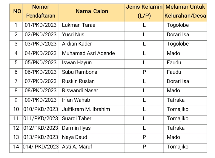 Dia enambahkan, sedangkan Kelurahan Faudu dan Mado sudah memenuhi dua kali kebutuhan dan satu pelamar perempuan. "Sesuai dengan pedoman pembentukan PKD walaupun tidak ada lagi keterwalikan perempuan maupun dua kali kebutuhan, proses tetap jalan.(Red)